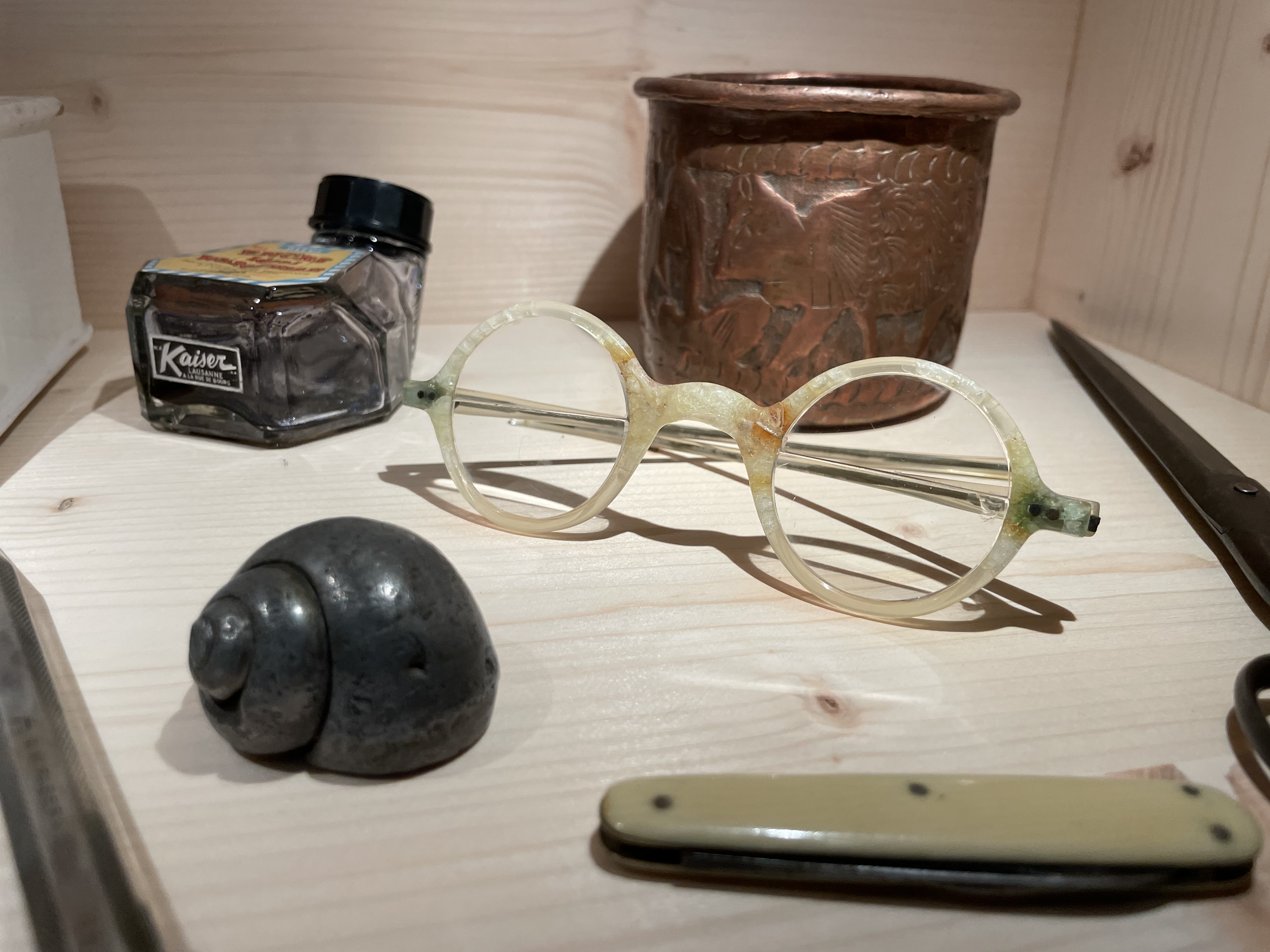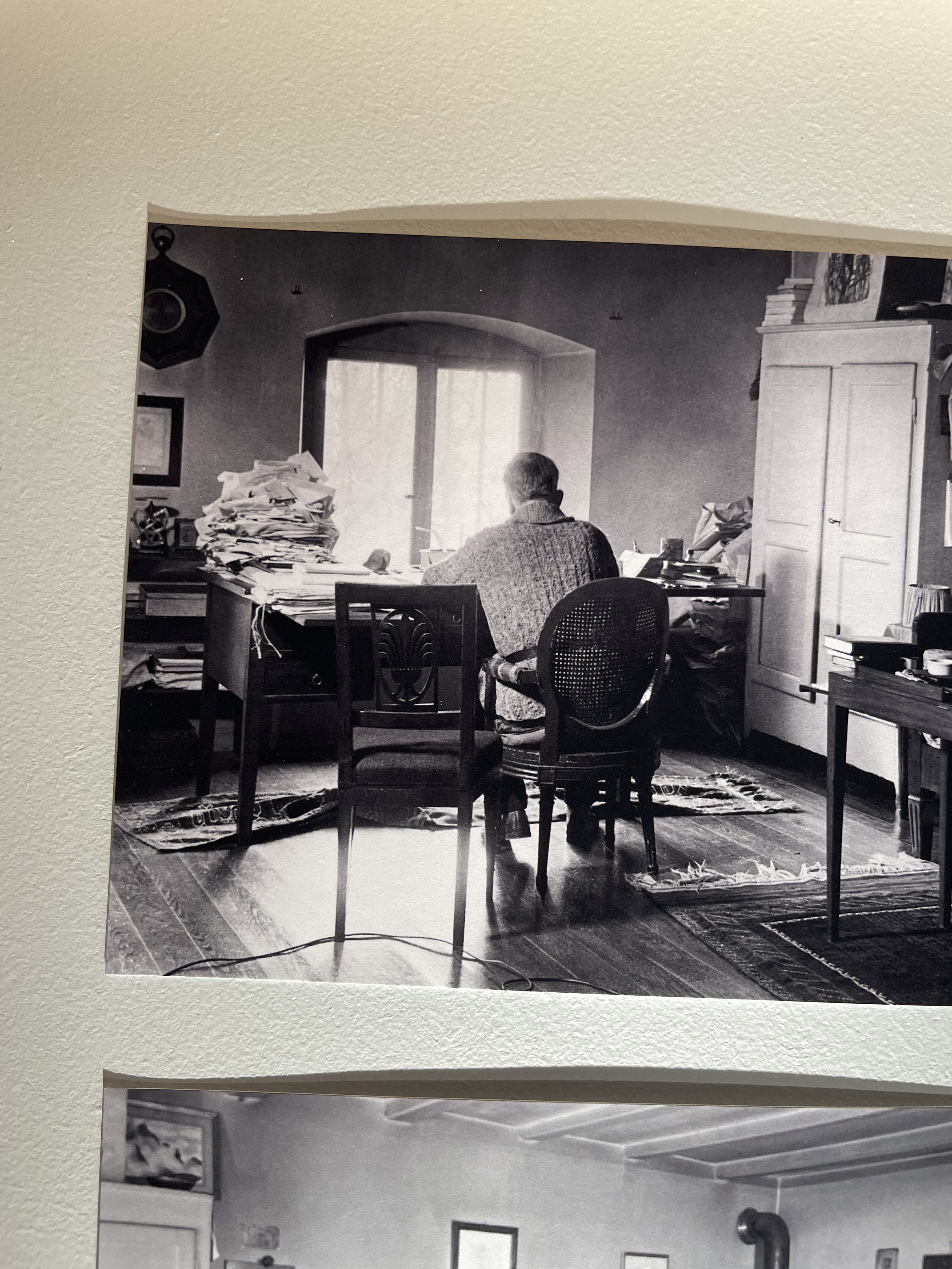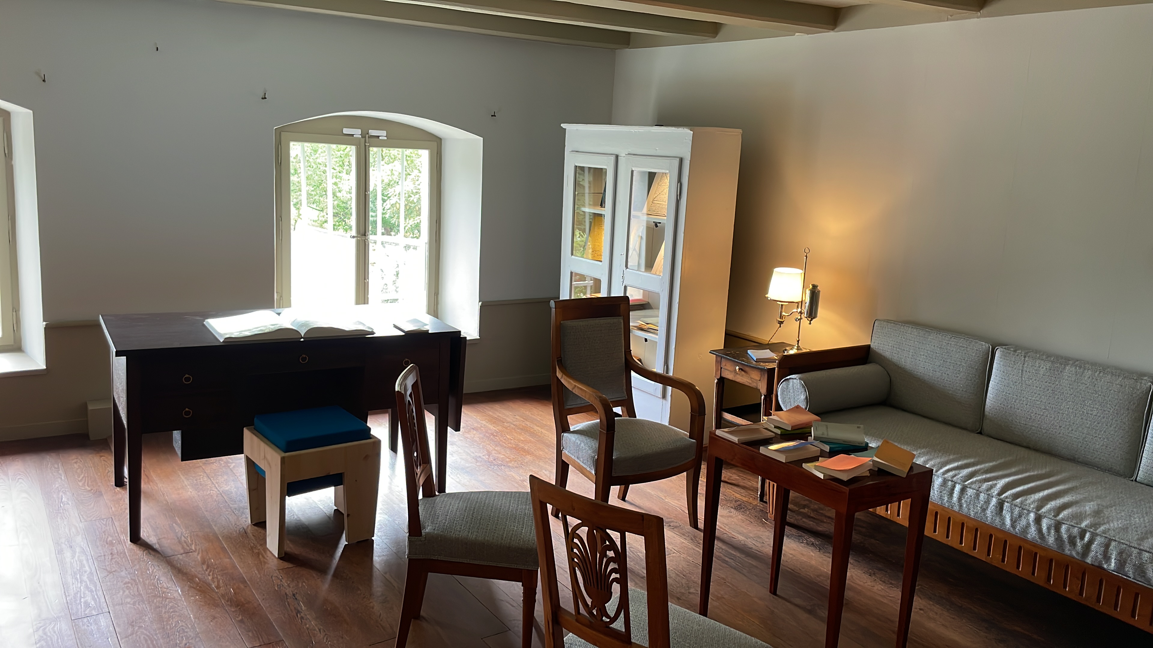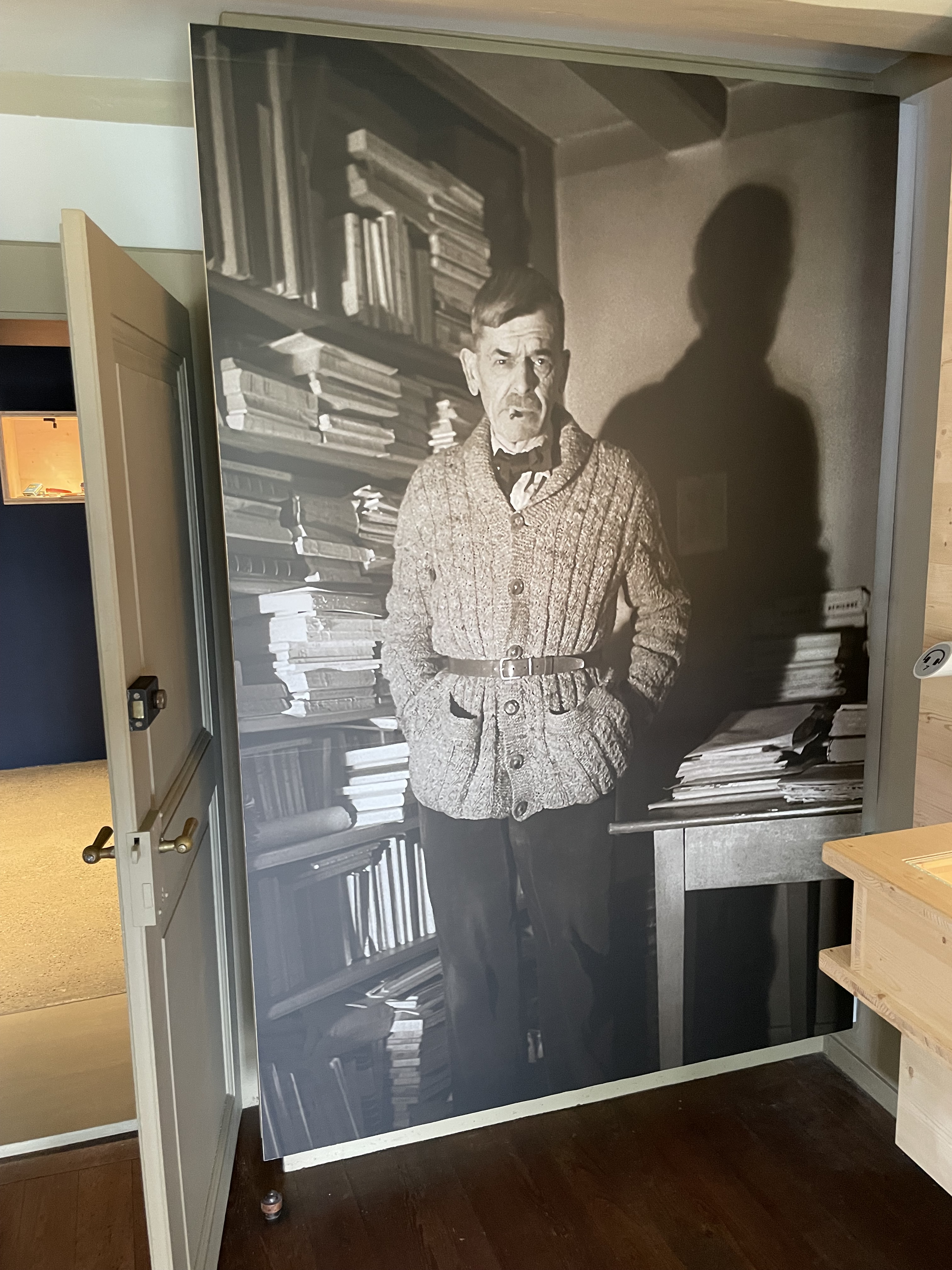 Mir hat es sehr gefallen, dass hier keine Konservierung stattgefunden hat: es wird nicht versucht, diesen Raum so zu bewahren, „als würde der Hausherr jeden Moment eintreten und weiter schreiben“. Doch siehst du auf Fotografien im Raum, wie er ausgesehen hat, als Ramuz noch lebte: der Tisch mit wirklich meterhohen Blättertürmen beladen, aufgeschlagene Bücher überall, der Bücherschrank rechterhand neben dem massiven Pult überquellend, die Couch mit einer aufgeschlagenen Decke. Alle 3 gezeigten Räume in diesem kleinen Museum sind von einer schlichten, modernen Inszenierung, die in meinen Augen sehr dem Geiste seines ehemaligen Bewohners entspricht.