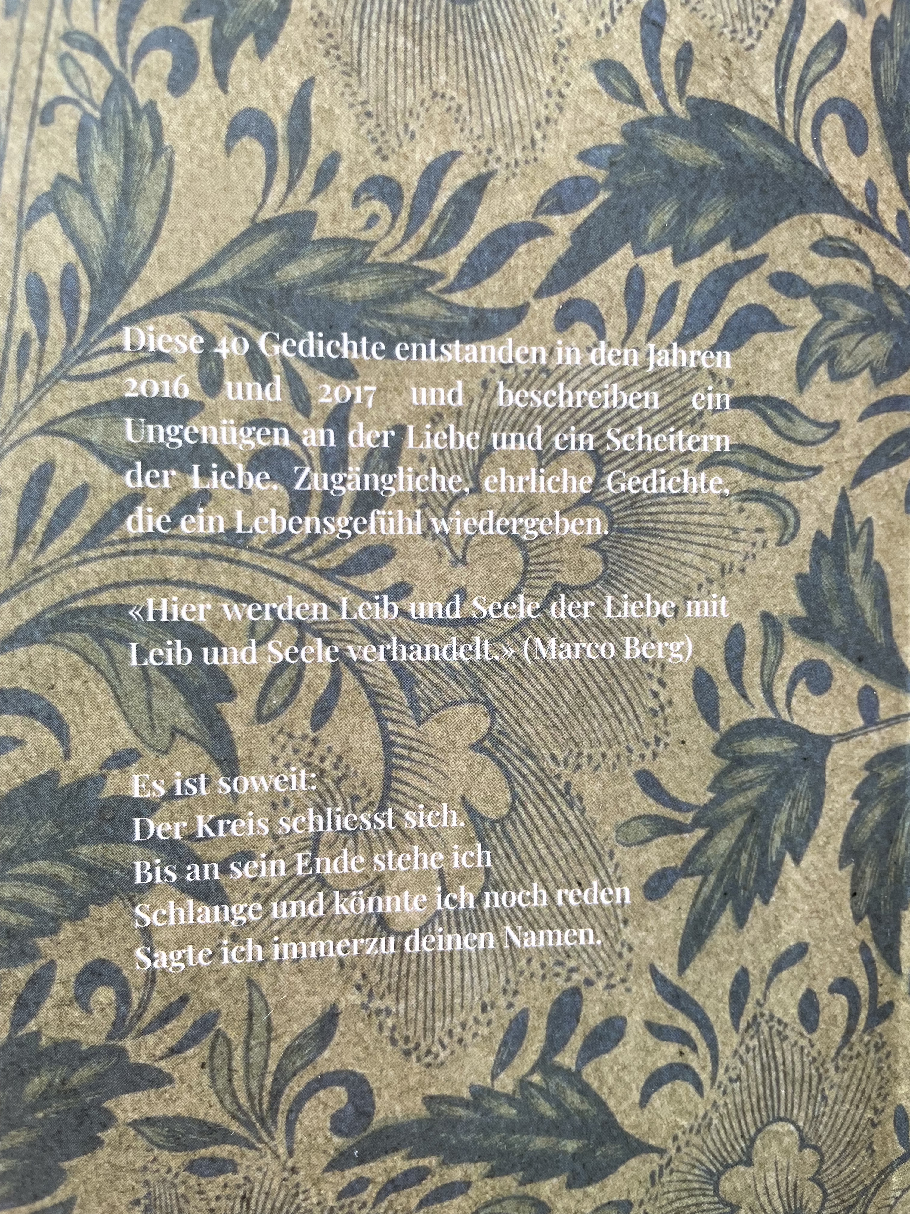 Der neue Gedichtband thematisiert und problematisiert die Liebe. Die Gedichte stammen aus den Jahren 2016 und 2017. Das Buch kann bei oliver.fueglister@gmail.com oder über eine Buchhandlung wie Orell Füssli direkt bestellt werden. Verkaufspreis: 15 CHF.